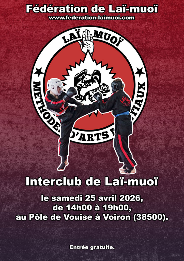 Le stage fédéral "maître-fondateur" du Laï-muoï aura lieu le samedi 24 janvier 2026 de 14h00 à 17h00 à la Halle des sports Jeannie Longo à Sassenage (2 Rue Pierre de Coubertin, 38360 Sassenage).